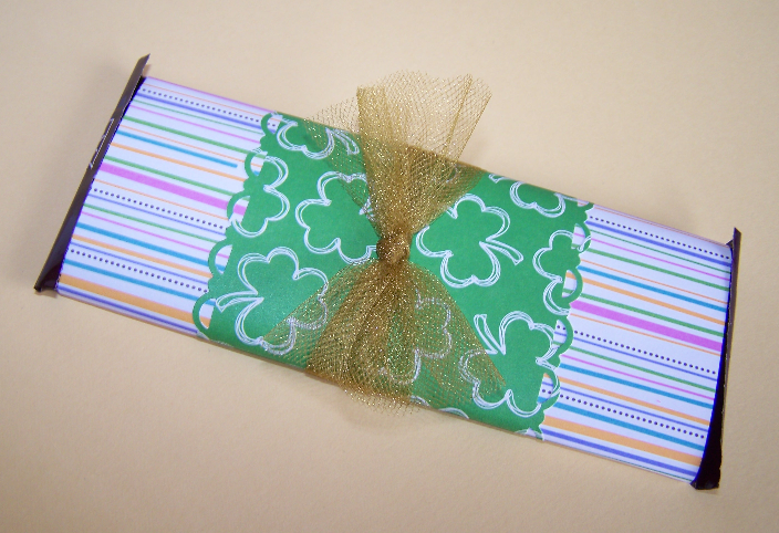 And the other items are Hershey bars wrapped in patterned paper. I loved the sketchy shamrocks, but wanted to add a little colorful variety with the striped paper.